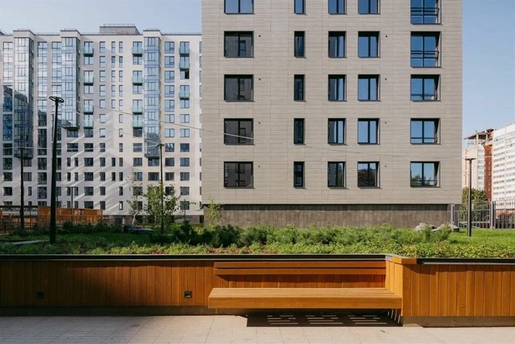 Здесь отсутствуют квартиры-студии, а лестничные площадки оформлены на контрастах черного, светло-серого и коричневого, что создает атмосферу шика.