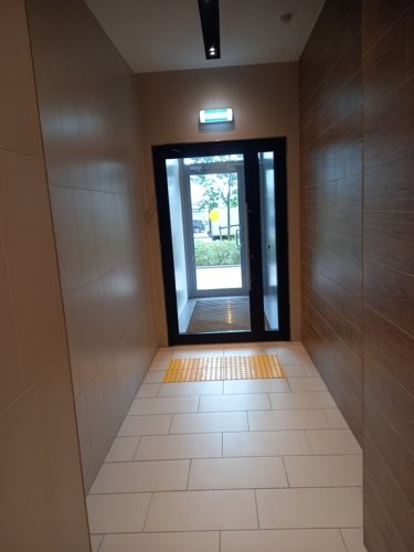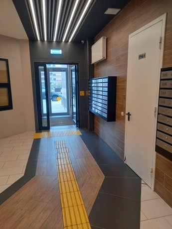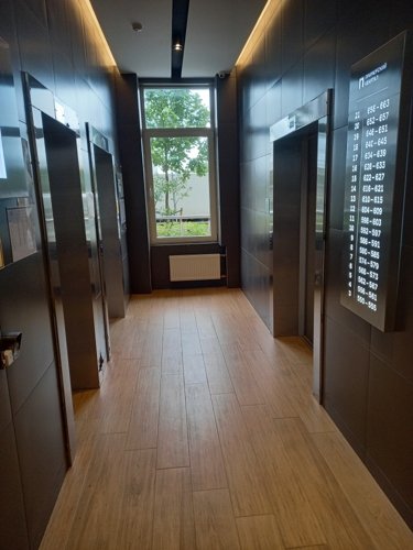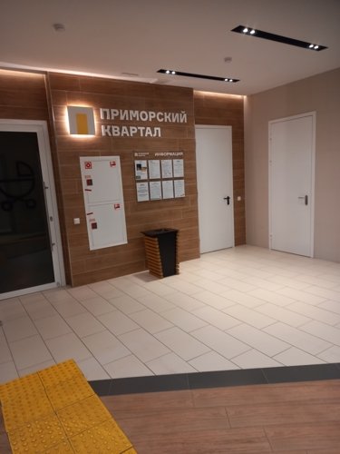 В холлах ЖК «Приморский квартал» использовали следующие цвета и материалы: 1) керамогранит, стилизованный под дерево, придавающий помещению тепло и естественность, 2) отделка под мрамор, добавляющая интерьеру респектабельности и изысканности, и 3) графитный чёрный цвет, выделяющий приоритет навигационных линий и придающий помещению элемент стильной строгости. В каждом холле есть колясочная и 3 лифта.