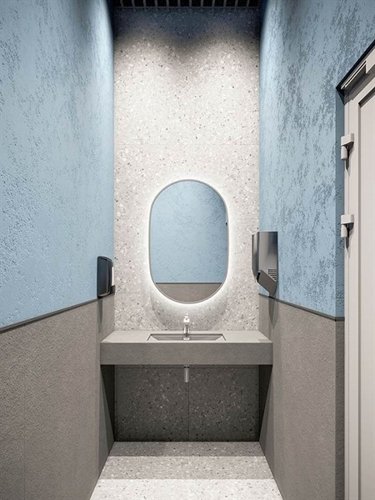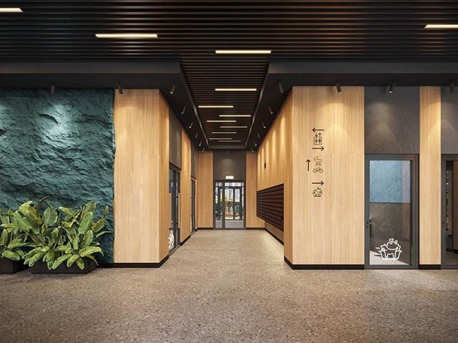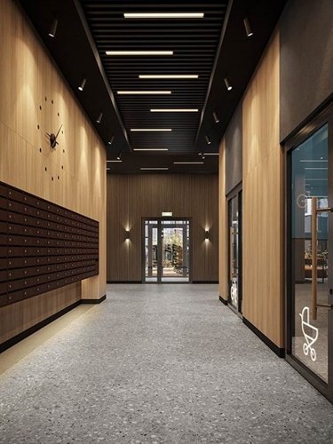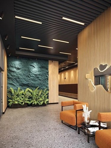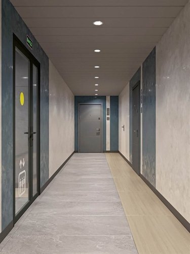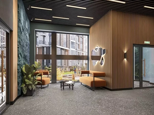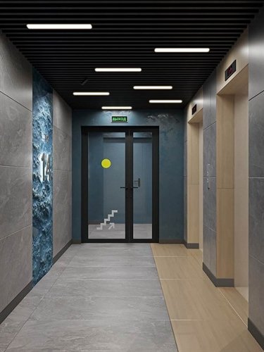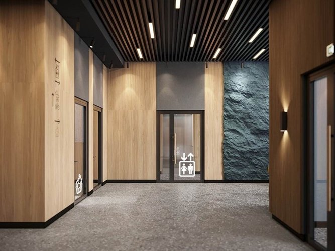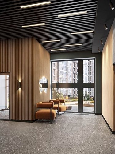 Дизайн входных групп — сочетание лаконичности отделки и декоративных элементов с текстурами из натурального камня и дерева с приглушённой подсветкой тёплым светом. Во входных группах расположены гостевые зоны с мягкой мебелью.